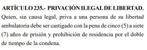 Mientras que, en el artículo 235, se establece que “Quien, sin causa legal, priva a una persona de su libertad ambulatoria debe ser castigado con la pena de cinco (5) a siete (7) años de prisión y prohibición de residencia por el doble de tiempo de la condena”.
